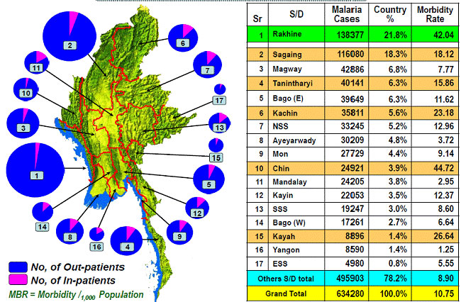 Sốt rét là một vấn đề y tế công cộng nghiêm trọng tại Myanmar, đặc biệt dọc theo những vùng biên giới quốc tế [129]. Các trường hợp mắc sốt rét được xác nhận tại Myanmar tăng từ 120.029 trong năm 2000 lên 447.073 ca mắc sốt rét trong năm 2008. Báo cáo Sốt rét thế giới (WMR) năm 2009 cho biết, Myanmar (Miến Điện), với dân số trên 50 triệu người, số ca sốt rét chiếm 17% tất cả các trường hợp sốt rét được ghi nhận ở Đông Nam Á, chiếm tỷ lệ cao nhất trong khu vực [47]. Có 400.000 trường hợp mắc bệnh sốt rét được xác nhận và khoảng 1.100 trường hợp tử vong do sốt rét trong năm 2008, xảy ra ở 284 thị trấn trong tổng số 324 thị trấn [85].