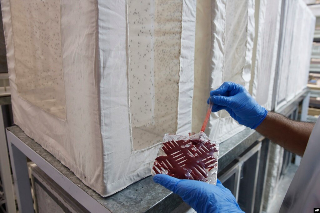 Một kỹ thuật viên từ công ty biotec Anh-Oxitec đang giữ một túi máu để nuôi muỗi Aedes aegypti đã