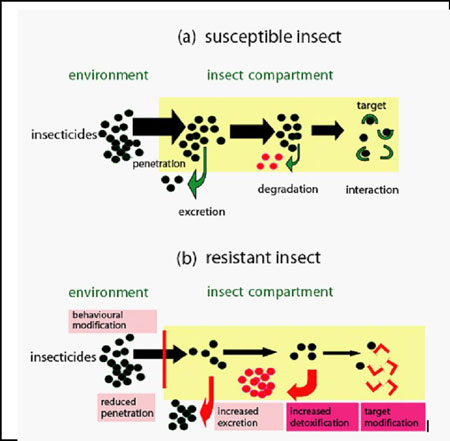 Gia tăng chuyển hóa và thay đổi vị trí đích liên quan đến tình trạng kháng hóa chất diệt côn trùng ở mức cao đối với các véc tơ sốt rét. Cho đến nay, các véc tơ sốt rétđã phát triển tínhkháng hóa chất chủ yếu ở nhóm hóa chất sử dụng trong y tế cộng đồng (ví dụ như pyrethroid,DDT, carbamate và lân hưu cơ (organophosphates)) và xuất hiện kháng chéo và đa kháng điều này đe dọa nghiêm trọng đến việc đạt được các Mục tiêu Phát triển Thiên niên kỷ (the Millennium Development Goals) để kiểm soát bệnh bệnh sốt rét (tức là giảm 75% các trường hợp mắc sốt rét trên toàn cầu vào năm 2015). Chiến lược theo dõi và giám sát thường xuyênđể đánh giá mức độ và cơ chế kháng hóa chất là điều rất cần thiết để giúp Chương trình kiểm soát bệnh sốt rét (MCP) xây dựngcác chiến lược kiểm soát véc tơ hiệu quả và bền vững hơn.