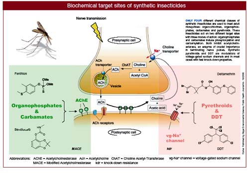 Hình 2. Cơ chế tác động gây chết muỗi của 4 nhóm hóa chất, vị trí đích của các nhóm Phốt pho hữu cơ và Carbamate là enzyme Acetylcholinesterase và vị trí đích của nhóm hóa chất Pyrethroid và DDT là cổng điện thế của kênh vận chuyển ion natri (WHO, 2006). (AchE: Enzyme Acetylcholinesterase, Ach: Chất dẫn truyền thần kinh Acetylcholine, ChAT: Enzyme vận chuyển Acetylcholine, vg-Na+ chanel: kênh vận chuyển ion natri, MACE: enzyme Acetylcholine đã bị thay đổi, kdr: Kháng hạ gục). |