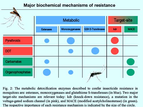 Cơchế này tạo ra một mức độ kháng mạnh mẽ nhất của muỗi đối với từng loại hóa chất. Sự kháng là kết quả của sự thay đổi về mặt cấu trúc enzym làm tăng khả năng giải độc của nó hoặc tăng số lượng enzym dẫn đến tăng sự đào thải độc tố hoá chất diệt côn trùng ra khỏi cơ thể chúng.  |
