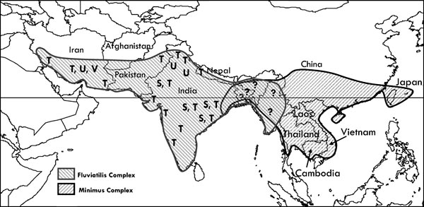Có ít thông tin về đặc điểm sinh học, sinh thái và phân bố của các loài này ngoài Ấn Độ. Phức hợp Fluviatilis được phân bố rộng rãi ở các vùng rừng đồi thấp của tây-nam châu Á. Tuy nhiên, sự phân bố theo các dạng nhiễm sắc thể được nghiên cứu kỹ ở Ấn Độ và Iran. Loài T có phân bố rộng nhất, bao gồm Ấn Độ, Nepal, Pakistan và Iran. Loài U được ghi nhận ở miền bắc Ấn Độ và Iran. Phức hợp Fluviatilis và phức hợp Minimus có sự phân bố chồng nhau ở Ấn Độ đến Myanmar, nhưng ranh giới của sự chồng chéo này chưa được biết chính xác.
