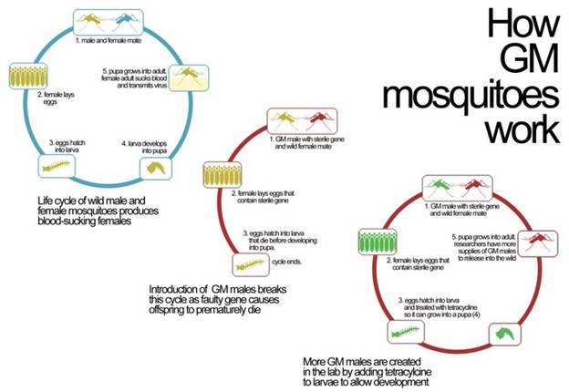 Các nhà khoa học sẽ thả các con muỗi đực biến đối gen để giao phối với muỗi cái, muỗi con sẽ chết từ khi còn là ấu trùng. Được triển khai từ năm 2014 tại một thị trấn ở phía Tây thủ đô Panama City của Panama, kết quả thí nghiệm của dự án này cho thấy, lượng muỗi tại khu vực thí nghiệm đã giảm 93%.