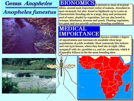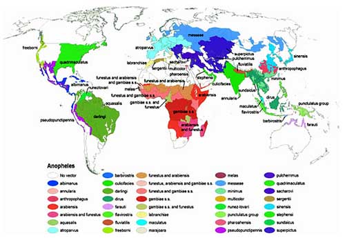 Trên thế giới có hơn 400 loài muỗi Anopheles khác nhau, nhưng chỉ có khoảng hơn 60 loài là vật chủ trung gian truyền bệnh sốt rét trong điều kiện tự nhiên tại các vùng bệnh lưu hành trên khắp thế giới, trong đó 30 loài có tầm quan trọng lớn. Mỗi loài có một kiểu hình tập tính khác nhau. Những loài có khả năng truyền bệnh cao như loài An. gambiae sensu stricto, An. arabiensis và An. funestus chiếm ưu thế ở châu Phi cận sa mạc Sahara. Những loài có khả năng truyền bệnh thấp hơn như An. stephensi ở vùng thành thị. Ở các nước châu Á, thì loài An. minimus, An. dirus chiếm ưu thế như các loài vector chính ở các vùng sốt rét lưu hành.