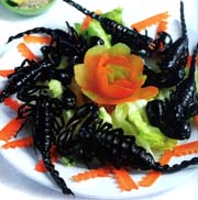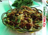 20. Côn trùng là những loại thức ăn đầy dinh dưỡng. Hiện nay, ở Củ Chi, Tây Ninh, Đồng Nai, bà con nông dân đang phát triển nghề nuôi dế cung cấp cho các nhà hàng đặc sản. Phổ biến có hai loại dế là dế đá và dế cơm. Tuy nhiên, dế đá ít được sử dụng vì chúng quá nhỏ, chế biến cực và dễ bị dòn sạm sau khi chiên. Dế cơm là loại được ưa chuộng vì chúng to, nhìn bắt mắt và con cái được cho là ngon nhất. Dế có thể chế biến thành nhiều món ăn khác nhau như dế nướng, dế chiên bơ, chiên sốt hành, xào cay, kho khô… Nhưng món dế chiên nhồi đậu phộng là được ưa thích nhất. Có lẽ vì ăn nó giòn giòn vui miệng và giữ nguyên được hương vị đặc biệt của thực phẩm. Khi chế biến dế, người ta phải dùng kéo cắt bỏ phần cánh. Tiếp đến là ngắt phần chóp đuôi, rút bỏ ruột, rửa sạch, để ráo nước rồi tẩm ướp thêm một ít gia vị. Sau đó, người ta nhồi một hạt đậu phộng rang vàng vào trong bụng dế làm nó căng tròn lên thật ngon mắt. Nhiều nơi còn áo đều một lớp bột lên dế trước khi chiên. Dế phải chiên trong chảo nhiều dầu, đảo nhanh tay và vớt ra ngay khi vừa chín giòn để không bị khô. Sau đó, tùy sở thích của thực khách mà đầu bếp sẽ đảo qua dế với ít bơ tỏi hay cho thêm sốt hành tây, hành lá cho dậy mùi thơm. Món dế giòn tan, thơm vị ngọt nhẹ, cộng hưởng với vị béo béo, bùi bùi của hạt đậu phộng trở thành thứ đồ nhắm độc đáo. Chấm kèm với muối tiêu chanh là đúng điệu nhất. Dế của Việt Nam là loại chất lượng cao nhất. Còn dế ở các nước bạn như Thái Lan hay Campuchia thường nhỏ hơn nên sau khi chế biến chỉ đạt được độ giòn xốp, còn hương vị thì kém rất nhiều. Nếu xét về khoản ấn tượng thì có lẽ món bò cạp đứng hạng nhất. Chẳng trách trong lúc ngồi ăn, tôi có nghe một trận la hét phấn khích của nhóm bạn ngồi trong góc xa xa khi anh phục vụ đặt đĩa bò cạp chiên giòn lên bàn. Món bò cạp của nhà hàng được tuyển chọn từ những con đầy đặn và khỏe mạnh. Chúng thường có xuất xứ từ vùng Tây Ninh, Châu Đốc. Cách chế biến món này cũng khá đơn giản. Bò cạp sau khi làm sạch, ướp một chút gia vị, cho vào chảo dầu nóng chiên giòn rồi xóc đều với ít bơ tỏi cho thơm. Gặp một con bò cạp, chấm với ít muối tiêu chanh, bỏ vào miệng cắn cái rộp. Bạn sẽ thấy chúng giòn tan như một miếng bánh snack mà trẻ nhỏ thường ăn, vị beo béo nhưng không ngấy. Ngoài vị ngon và lạ, cái cảm giác vui vui xen lẫn hồi hộp khi vượt qua nỗi sợ hãi để thưởng thức món ăn lạ lùng này chính là điểm hấp dẫn làm thực khách thích thú và muốn thử thách.