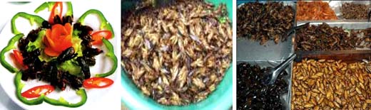 Những món ăn đặc sản. Côn trùng được coi là món khoái khẩu ở một số vùng nhưng lại là đồ kiêng kỵ với vùng khác. Tại một số nước châu Á như Thái Lan, Ấn Độ, Banglades..., rất nhiều cửa hàng trên hè phố bán đủ các món ăn làm từ dế, châu chấu, gián, bọ cánh cứng, sâu tre và trứng kiến...Người dân Thái Lan "nghiện" món côn trùng chiên hơn cả, nhất là châu chấu. Nhiều người lại khoái chén các con gián có nhiều trứng trong bụng vì hương vị thơm ngon của nó, hay thích bọ cánh cứng vì chúng có nhiều thịt hơn. Có người thích ăn bọ cạp, đặc biệt là phần đuôi vì tin rằng nọc bọ cạp sẽ làm họ mạnh mẽ hơn tại Việt Nam, những món ăn chế biến từ côn trùng cũng thu hút nhiều người, như đuông rán bơ, dế lăn bột rán giòn, bò cạp rán bơ, châu chấu nướng...