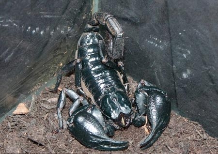 Bọ cạp đen Heterometrus laoticus là một loài bọ cạp hung hãn được tìm thấy ở những vùng có than bùn ở Việt Nam và Lào. Chúng thuộc họ bọ cạp rừng khổng lồ Heterometrus và có thể dài tới 12cm. Các con bọ cạp đen có xu hướng sống thành nhóm, nhưng cũng được cho là có sở thích ăn thịt đồng loại. Nếu bị khiêu khích, bọ cạp đen có thể trở nên vô cùng hung hăng, đặc biệt đối với các con bọ cạp khác và những kẻ thù săn mồi như cầy meerkat và loài rết Scolopendra. Bất chấp điều đó, hầu hết bọ cạp đen không có vết cắn nguy hiểm chết người. Các triệu chứng do một vết cắn của loài này gây ra, được phân loại là nhẹ. Cho tới nay, chưa có bất kỳ trường hợp người nào tử vong vì chúng. Tuy nhiên, vết cắn có thể gây đau tại chỗ, viêm, sưng tấy và đỏ da kéo dài tới vài ngày. |