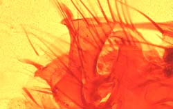 - Tấm trước mông mỗi bên có 3 lông, lông ở giữa dài nhất, dài hơn 2 lần lông thứ nhất. Tấm mông phẳng, có 20-22 vòng cảm giác, giữa các vòng cảm giác có tơ mảnh dài. Bút đuôi có 1 lông lớn dài ở đỉnh và 1 lông nhỏ hơn ở gần đỉnh.
