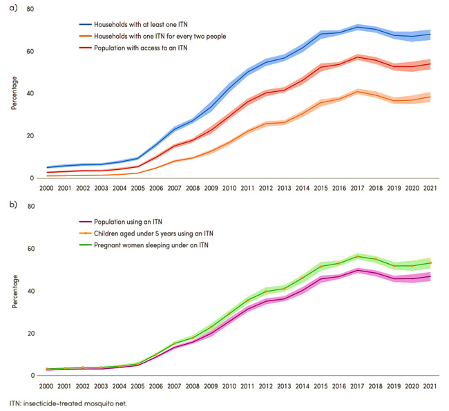 Đến năm 2021, 68% hộ gia đình ở khu vực cận Sahara châu Phi có ít nhất một ITN, tăng từ khoảng 5% vào năm 2000. Tỷ lệ hộ gia đình sở hữu ít nhất một ITN cho mỗi hai người đã tăng từ 1% năm 2000 lên 38% vào năm 2021. Trong cùng thời gian, tỷ lệ dân số tiếp cận ITN trong hộ gia đình của họ đã tăng từ 3% lên 54%. Tỷ lệ dân số ngủ trong ITNs cũng tăng lênđáng kể từ năm 2000 đến năm 2021 đối với toàn bộ dân số (từ 2% đến 47%), đối với trẻ em dưới 5 tuổi (từ 3% đến 53%) và đối với phụ nữ mang thai (từ 3% đến 53%). Nhìn chung, khả năng tiếp cận và sử dụng ITNs tại khu vực cận Sahara châu Phiđã giảm từ năm 2017 (Hình 3).
