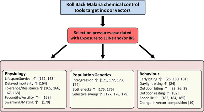 Ngày càng có nhiều véc tơ sốt rét đã có những thay đổi trong hành vi để đáp ứng với các biện pháp can thiệp kiểm soát véc tơ hóa học trong nhà hiện nay. Những thay đổi về thời gian đốt và tỷ lệ đốt trong nhà của các véc tơ chính, cũng như những thay đổi về thành phần loài của quần thể muỗi đe dọa tiến bộ đạt được trong việc kiểm soát lây truyền bệnh sốt rét. Quần thể muỗi đốt ngoài trời góp phần lan truyền bệnh sốt rét ở nhiều vùng khu vực cận hoang mạc Sahara châu Phi và đặt ra những thách thức mới vì chúng không thể được theo dõi hoặc kiểm soát một cách đáng tin cậy bằng các công cụ thông thường. Vì vậy cần có các phương pháp tiếp cận mới có thể được sử dụng để nhắm vào các quần thể véc tơ sốt rét ngoài trời.