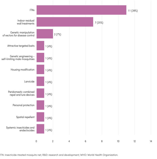 Trạm quan sát toàn cầu về nghiên cứu và phát triển sức khỏe của WHO (GOHRD) đã đối chiếu các biện pháp can thiệp phòng chống véc tơ sốt rét hiện đang được phát triển, được báo cáo theo bệnh, loại can thiệp và giai đoạn phát triển. GOHRD hiện liệt kê 28 sản phẩm phòng chống véc tơ trong quy trình R&D (Hình 9). Mười một (39%) trong số các sản phẩm này là ITNs và bảy sản phẩm (25%) là sản phẩm phun tồn lưu tường vách trong nhà.Mười ba sản phẩm (46%) đang trong giai đoạn tạo dữ liệu để hỗ trợ đánh giá về độ an toàn, chất lượng và hiệu quả côn trùng học. Bảy sản phẩm (25%) đang trong quá trình thử nghiệm dịch tễ học, sáu sản phẩm (21%) đang được WHO đánh giá để đưa vào danh sách sơ tuyển hoặc khuyến nghị chính sách của WHO và hai sản phẩm (7%) đang ở giai đoạn phát triển nguyên mẫu.