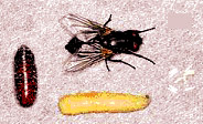 Vòng đời của ruồi nhà: Bên phải – trứng, Bên dưới - ấu trùng (dòi), Bên trái – nhộng, Bên trên – Ruồi trưởng thành |
