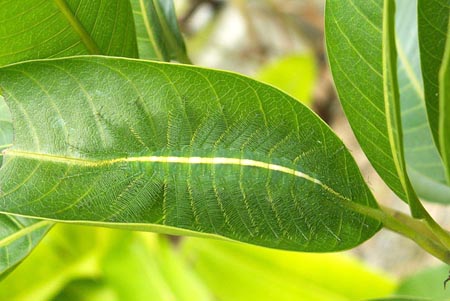 Một loài sâu bướm (ở giữa chiếc lá) ngụy trang theo kiểu trong suốt. |