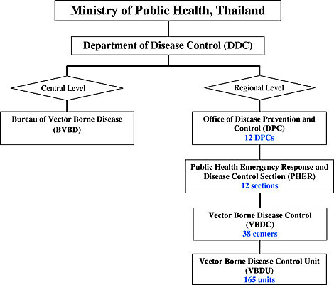 Chương trình bao gồm 12 khu vực dưới sự chỉ đạo trực tiếp của Giám đốc Văn phòng Phòng ngừa và Kiểm soát dịch bệnh (Disease Prevention and Control-DPC). Đơn vị dưới văn phòng DPC là Bộ phận Bệnh do véc tơ truyền (Vector-Borne Disease Section-VBDS) được thành lập để đối phó với các vấn đề về bệnh do véc tơ truyền chính ở mỗi khu vực DPC. Năm 2003, có 39 Trung tâm Kiểm soát bệnh do Véc tơ truyền (Vector-Borne Disease Control - VBDC) và có 302 Phòng Kiểm soát Véc tơ truyền bệnh (Vector-Borne Disease Control Units - VBDU) được thành lập ở cấp tỉnh và cấp huyện, nhưng thời gian gần đây đã giảm xuống lần lượt còn 38 VBDCs và 165 VBDUs. Ngoài ra, có một số huyện và thành phố tự trị hoạt động dưới sự chỉ đạo của Bộ Nội vụ. Tháng 10 năm 2011, có 12 văn phòng DPC khu vực đã trải qua tái cơ cấu hơn nữa, và VBDSs đã được sáp nhập và đổi tên thành Bộ phận Hỗ trợ Kỹ thuật hoặc Phản ứng Khẩn cấp đối với các Thảm họa y tế cộng đồng. Điều này dẫn đến một số nhầm lẫn với các ngành y tế cộng động khác có liên quan, để người dân biết chính xác để liên hệ được tư vấn về cách sử dụng hóa chất diệt côn trùng và ứng dụng kiểm soát véc tơ thích hợp và giám sát kỹ thuật. Điều này cũng bao gồm các thành phố, huyện tự trị thuộc Bộ Nội vụ (hình 1).