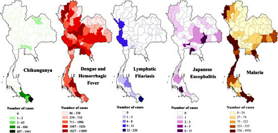 Thái Lan tiếp tục phải đối mặt với các bệnh lan truyền hiện đang lưu hành và sự xuất hiện trở lại các bệnh do muỗi truyền, đặc biệt là bệnh sốt rét, sốt xuất huyết Dengue (SXHD), giun chỉ bạch huyết, viêm não Nhật Bản và gần đây là bệnh do virus Chikungunya. Tất cả các ký sinh trùng và virus này được lan truyền sang người thông qua loài muỗi thích hợp và một số loài muỗi có khả năng truyền nhiều tác nhân gây bệnh khác nhau cho con người. Hiện nay, các bệnh này phân bố ở Thái Lan được thể hiện trong hình 2.