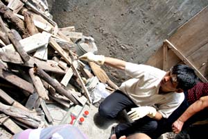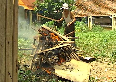 | Toàn bộ số củi, tấm ván ép tường được đem đi đốt ở bãi đất trống gần đó. Ảnh: N.T. |