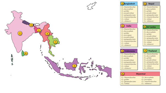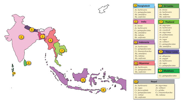 Ở khu vực Đông và Nam Á của TCYTTG, bệnh sốt rét lan truyền qua muỗi Anopheles; bệnh giun chỉ bạch huyết lan truyền thông qua muỗi Culex sp., Mansonia sp., Anopheles sp. và Aedes sp.; Viêm não Nhật Bản do muỗi Culex sp. truyền; sốt xuất huyết, Chikungunya và virus Zika lan truyền do muỗi Aedes sp. và bệnh Kala-Azar lan truyền qua muỗi Phlebotomus sp. Trong số hơn 3.727 loài muỗi trên thế giới, thì có hơn 300 loài được báo cáo ở khu vực Đông và Nam Á. Trong số đó, có 76 loài đóng vai trò là véc tơ truyền bệnh quan trọng trong khu vực. Các Bản đồ sau đây sẽ trình bày sự phân bố các véc tơ truyền bệnh ở khu vực Đông và Nam Á theo danh sách các véc tơ và được sử dụng để định loại.