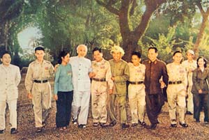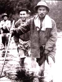 Chủ tịch Hồ Chí Minh trên đường đi công tác, Tuyên Quang (1951). Dù được nhường đi ngựa, nhưng Bác nhất quyết chỉ đi bộ như mọi người (nguồn ảnh:Báo tuổi trẻ) |