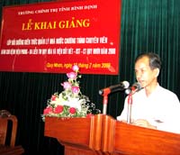 Phát biểu khai mạc lớp học ông Nguyễn Cảnh Huệ Hiệu trưởng nêu rõ Trường Chính trị Bình Định được Tỉnh ủy và UBND tỉnh giao nhiệm vụ đào tạo, bồi dưỡng đội ngũ cán bộ lãnh đạo, quản lý các cấp của cấp tỉnh; trong đó có nhiệm vụ bồi dưỡng kiến thức, kỹ năng phục vụ hành chính và QLNN ngạch chuyên viên. Đây là lớp thứ hai, Trường Chính trị tỉnh Bình Định mở cho hai đơn vị Viện Sốt rét-KST-CT Quy Nhơn và Bệnh viện Phong-Da liễu Quy Hòa với số lượng 72 học viên. Mục đích lớp học là nhằm trang bị, bổ sung và nâng cao kiến thức nghiệp vụ về QLNN, đảm bảo tiêu chuẩn của cán bộ, công chức, viên chức ở ngạch chuyên viên và tương đương để làm cơ sở thi nâng ngạch chuyên viên hoặc hợp thức hóa các chức danh đang hưởng ngạch chuyên viên.