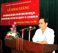 Thực hiện thỏa thuận giữa Ban giám hiệu Trường Chính trị tỉnh Bình Định và Lãnh đạo Bệnh viện Phong-Da liễu TW Quy Hòa và Viện Sốt rét-KST-CT Quy Nhơn, ngày 18/7/2008 Trường Chính trị Bình Định đã tổ chức lễ khai giảng lớp Bồi dưỡng kiến thức Quản lý Nhà nước (QLNN) chương trình chuyên viên cho hai đơn vị thuộc Bộ Y tế đóng trên địa bàn tỉnh nhằm đáp ứng yêu cầu nâng cao hiệu lực QLNN, tiêu chuẩn hóa công chức góp phần thực hiện thành công chương trình tổng thể cải cách hành chính nhà nước.