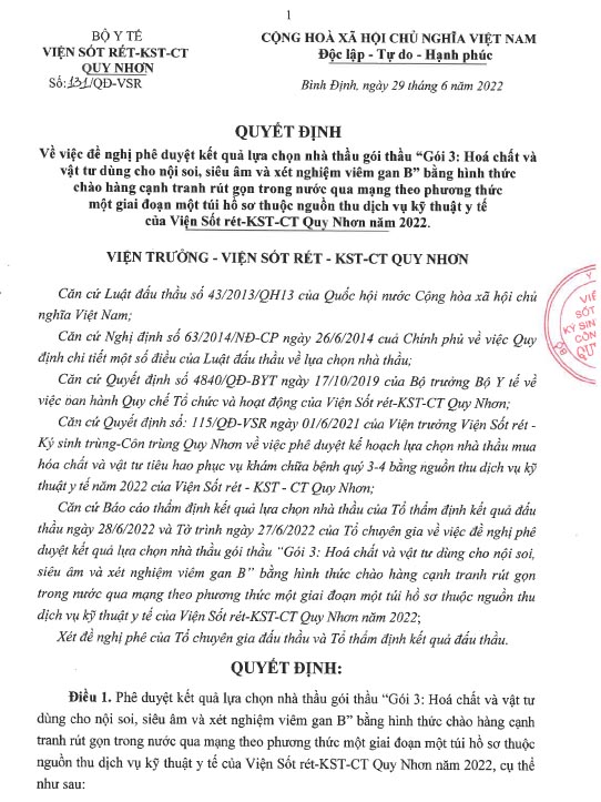 chi tiết Quyết định số 131/QĐ-VSR phê duyệt lết quả lựa chọn nhà thầu gói thầu - Gói 3-Hóa chất vật tư dùng cho nội soi, siêu âm và xét nghiệm VGB, xin xem phần tệp tin đính kèm: