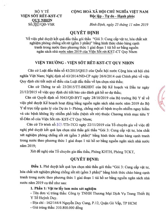 Full đầy đủ QĐ: Quyết định số 380/QĐ-VSR ngày 25/11/2019 về việc phê duyệt kết quả lựa chọn nhà thầu gói thầu Gói 3: Cung cấp vật tư, hóa chất xét nghiệm PCSR (gồm 3 phần) bằng hình thức đấu thầu rộng rãi trong nước theo phương thức 1 giai đoạn 1 túi hồ sơ bằng Nguồn Ngân sách Nhà nước cấp năm 2019 của Viện Sốt rét-KST-CT Quy Nhơn