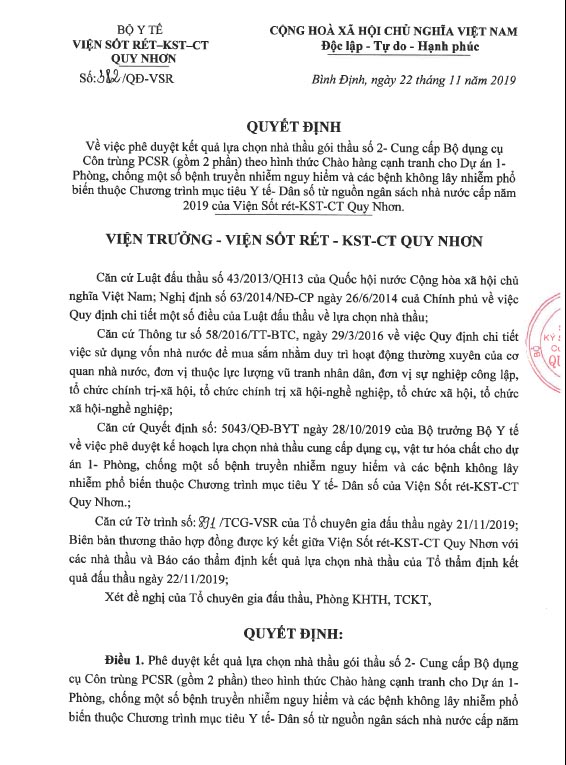 Quyết định số 382/QĐ-VSR ngày 22/11/2019 về việc phê duyệt kết quả lựa chọn nhà thầu gói thầu số 2: Cung cấp dụng cụ Côn trùng PCSR (gồm 2 phần) bằng hình thức Chào hàng cạnh tranh cho Dự án 1-Phòng, chống một số bệnh truyền nhiễm nguy hiểm và các bệnh không lây truyền phổ biến thuộc Chương trình mục tiêu Y tế-Dân số từ Nguồn Ngân sách Nhà nước cấp năm 2019 của Viện Sốt rét-KST-CT Quy Nhơn