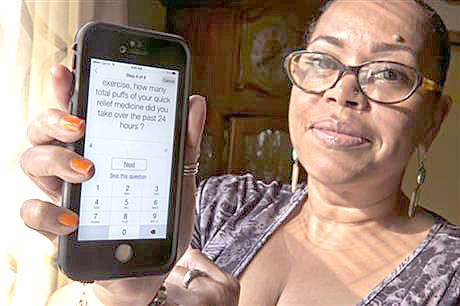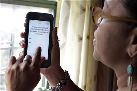 Trong bức hình chụp ngày 2/7/2015 này, cô Elizabeth Ortiz mắc bệnh hen suyễn đã sử dụng ứng dụng điện thoại thông minh Asthma Health để theo dõi tình trạng sức khỏe, đang chụp hình trong căn hộ của cô tại Bờ Đông Nam thành phố New York. Ortiz đo sức khỏe của phổi mỗi ngày bằng việc thở vào trong một thiết bị nhựa giá rẻ và sau đó gõ kết quả vào trong ứng dụng, nó sẽ hỏi nếu cô có gặp khó khăn trong việc thở hoặc ngủ hay không, hoặc uống thuốc vào ngày hôm đó (AP Photo/Richard Drew).