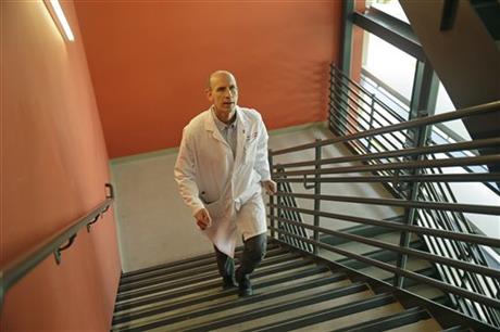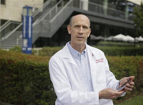 Trong bức hình chụp vào thứ ba ngày 7/7/2015 này, Bs Michael V. McConnell, một bác sĩ tim mạch đang sử dụng một ứng dụng để nghiên cứu bệnh tim, đang chụp ảnh với điện thoại thông minh của ông bên ngoài Trường Y Học Stanford tại Stanford, bang California. Các nhà khoa học như McConnell đang giám sát các nghiên cứu sử dụng những ứng dụng iPhone chuyên biệt cho biết chúng có tiềm năng biến đổi việc nghiên cứu y học bằng cách giúp họ thu thập dữ liệu đều đặn từ xa với số người tham gia nhiều hơn trong các nghiên cứu y học (AP Photo/Richard Drew).
