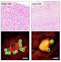 Bằng cách đếm số lượng vi hạt gắn kết với các tế bào ung thư (ảnh dưới), hệ thống D3 phân loại các mẫu sinh thiết ung thư cổ tử cung có nguy cơ cao và nguy cơ thấp cũng như bệnh lý học cổ điển (ảnh trên) (Bệnh viện đa khoa Massachusetts)