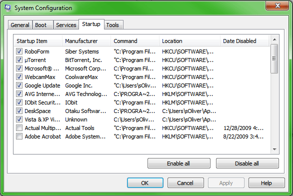 Một trong những việc nên làm nhất để tối ưu hoá thời gian khởi động máy là loại bỏ bớt những ứng dụng khởi động cùng với Windows. Việc chạy các ứng dụng này thường làm chậm máy nên bạn phải mất một thời gian… ngồi chờ để máy ổn định, sau đó mới dùng được. Muốn loại bỏ bớt các ứng dụng không cần thiết, bạn hãy vào Start > Run (hoặc nhấn phím Windows + R) rồi nhập lệnh msconfig. Trong cửa sổ mở, ra bạn chọn vào thẻ Startup. Danh sách này cho bạn biết chức năng của từng ứng dụng để bạn có thể loại bỏ nếu không dùng nữa. Bạn cũng có thể dùng các phần mềm tối ưu hệ thống để loại bỏ (chẳng hạn như ứng dụng Soluto).