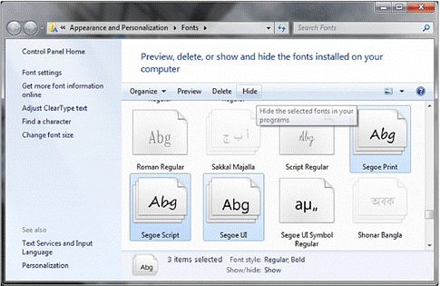 Ngay từ những buổi đầu tiên ra mắt, Windows đã bắng đầu tải font chữ khi khởi động, và điều này đã kéo dài thêm thời gian khởi động máy của bạn. Windows 7 tải 200 font khi mở lên, và số lượng này còn tăng khi chúng ta dùng Microsoft Office (người Việt ta còn thêm một mớ font VNI nữa). Tuy nhiên một sự thật "đau lòng" đó là ta chỉ dùng rất ít font trong số đó, vì vậy bạn có thể tạm thời ẩn chúng đi để tăng tốc quá trình boot máy. Trong Windows 7, bạn mở thư mục Font của máy (Control Panel > Fonts), sau đó bỏ những font chữ bạn ít dùng hoặc không dùng đi. Sau đó nhấn nút Hide trên thanh công cụ. Bằng cách này, bạn có thể mở lại những font chữ đã ẩn khi cần đến mà lại cải thiện được tốc độ boot máy. Quá đơn giản phải không nào. Tuy nhiên hãy chú ý rằng bỏ đi một vài font thì chẳng ăn nhằm gì, bạn cần làm với một số lượng lớn thì mới thấy rõ tác dụng.