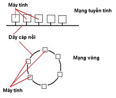 - Mạng vòng. Các máy nối nhau như trên và máy cuối lại được nối ngược trở lại với máy đầu tiên tạo thành vòng kín. Thí dụ mạng vòng thẻ bài IBM (IBM token ring).