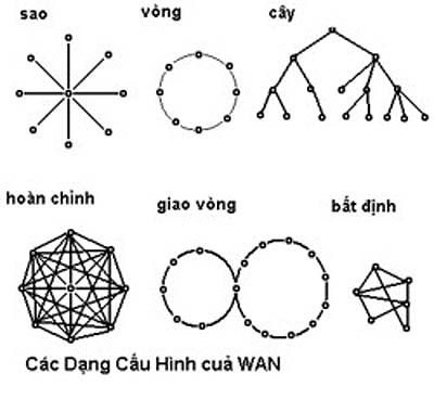 Có nhiều kiểu cấu hình cho WAN dùng nguyên lý điểm tới điểm như là dạng sao, dạng vòng, dạng cây, dạng hoàn chỉnh, dạng giao vòng, hay bất định.