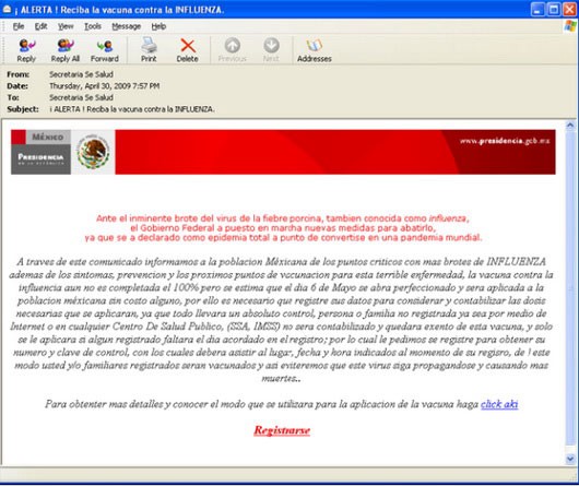 Cụ thể, tin tặc hiện đã khởi động một chiến dịch phát tán thư rác độc hại quy mô lớn giả mạo cung cấp thông tin về một loại vắc-xin có khả năng điều trị bệnh “cúm lợn”. Trong những bức thư rác này thường có đường liên kết đến một trang web cung cấp đầy đủ thông tin hơn nữa.