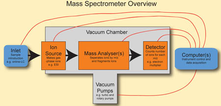 Một mẫu được tải vào trong hệ thống MS và thực hiện quá trình hóa thành hơi (vaporization). Các thành phần của mẫu được ion hóa nhờ một số phương pháp (ví dụ tác động lên chúng với các bức xạ electron), dẫn đến kết quả hình thành các nguyên tử sạc (ions). Các ion đươc phân tích và đo chỉ số mass-to-charge ratio trong bộ phận phân tích nhờ vào điện từ trường (electromagnetic fields). Các ion sẽ được phát hiện thường bằng phương pháp định lượng. Các tín hiệu ion sẽ chuyển thành khối phổ (mass spectra). Ngoài ra, các thiết bị MS bao gồm 3 modules: