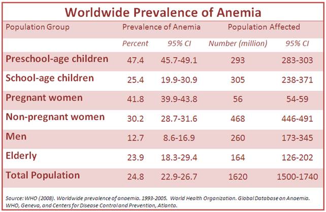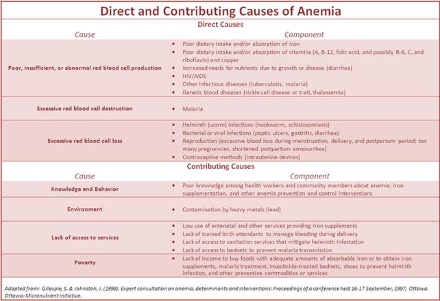 Thiếu máu có thể do nhiều nguyên nhân khác nhau, có thể các nguyên nhân đó gây nên tình trạng thiếu máu đơn thuần hoặc nhiều nguyên nhân cùng đồng thời dẫn đến thiếu máu trên bệnh nhân đó. Nguyên nhân có thể do thiếu máu suy dưỡng, thiếu máu thiếu sắt, thiếu máu giun móc hay các loại ký sinh trùng khác, thiếu máu do mất máu, rối loạn cơ chế sinh máu, cơ chế miễn dịch, bất thường thiếu máu bẩm sinh.