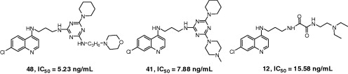 Trong nghiên cứu các 4-aminoquinolines mới để đối phó với tình trạng kháng thuốc này, các thuốc đã thử nghiệm và kết quả bước đầu cho thấy hợp chất 48, 41 cho tiềm lực với IC50 5.23, và 7.88 ng/mL và hợp chất 12 cho hoạt tính trung bình với nồng độ IC50 là 15.58 ng/mL chống lại dòng 3D7 của Plasmodium falciparum.