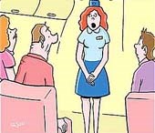 Trong khi đang thông báo, nữ tiếp viên nhận thấy có một hành khách vừa chăm chú lắng nghe, vừa nhìn chòng chọc vào ngực mình, nên sau khi thông báo xong cô ta rất lấy làm hãnh diện và hỏi ông khách: