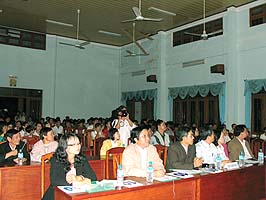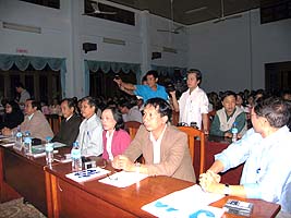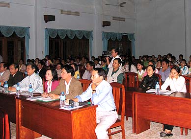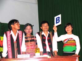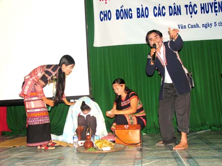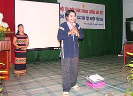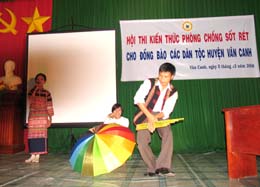 Đ/c Lê Thành Trang-Chủ tịch UBND huyện Vân Canh đang trình bày tiết mục bài chòi về phòng chống sốt rét do đ/cTriệu Nguyên Trung-Viện trưởng Viện SR-KST-CT Quy Nhơn sáng tác |