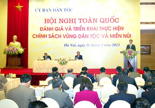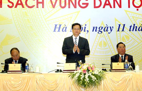 Phát biểu tại hội nghị, Thủ tướng Nguyễn Tấn Dũng nhấn mạnh, đảng và nhà nước đặc biệt quan tâm tới đồng bào vùng dân tộc. Trong những năm qua, chính sách cho vùng dân tộc và miền núi đã thúc đẩy phát triển kinh tế - xã hội, nâng cao đời sống vật chất, tinh thần của đồng bào. Thủ tướng Nguyễn Tấn Dũng đề nghị các đại biểu tập trung thảo luận đánh giá khách quan những mặt đạt được, những tồn tại, hạn chế trong việc triển khai chính sách vùng dân tộc và niền núi, từ đó đề xuất bổ sung, sửa đổi chính sách chưa phù hợp, đặc biệt đề xuất chính sách nhằm giảm nhanh hộ nghèo theo hướng nhanh và bền vững.