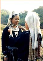 Về cưới xin, trai gái muốn lấy được nhau phải so tuổi, bói chân gà xem có hợp nhau không. Có tập tục chăng dây, hát đối đáp giữa nhà trai và nhà gái trước khi vào nhà, hát trong đám cưới. Lúc đón dâu, cô dâu được cõng ra khỏi nhà gái và bước qua cái kéo mà thầy cúng đã làm phép mới được vào nhà trai.