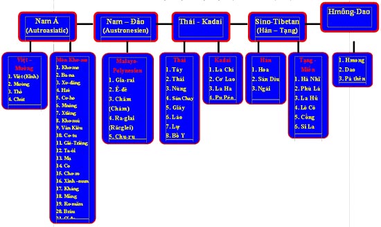 Sơ đồ 8 nhóm ngôn ngữ trong 5 ngữ hệ của 54 dân tộc Việt Nam