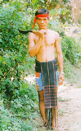 Nam để tóc ngắn quấn khăn màu chàm nhiều vòng trên đầu. Y phục gồm áo và khố. Aáo có hai loại cơ bản: