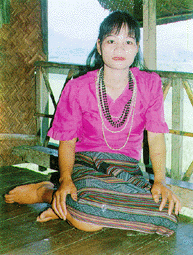 Khố - Aáo - Váy. Với đặc điểm áo nữ xẻ ngực màu chàm đen và hàng kim loại bạc tròn đính ở mép cổ và hai bên nẹp áo. Váy trang trí theo các mảng lớn trong bố cục dải ngang.