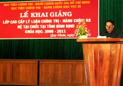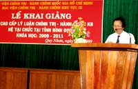Thay mặt lãnh đạo tỉnh, Ông Nguyễn Văn Thanh, Phó Bí thư tỉnh Uỷ tỉnh Bình Định đã phát biểu cảm ơn sự quan tâm của Học viện trong công tác đào tạo cán bộ chủ chốt về lý luận, hành chính; đồng thời chỉ đạo các học viên phải cố gắng học tập đạt thành tích cao nhất và chấp hành nội quy của nhà trường. Các đơn vị cơ quan cần tạo điều kiện cho các cán bộ được tham gia học tập đầy đủ và thuận lợi.
