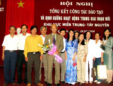 TTƯT.BS. Nguyễn Võ Hinh ( người đứng giữa cầm hoa) chụp hình lưu niệm cùng cựu học sinh khóa I trường Viện Sốt rét - KST-CT Quy Nhơn |