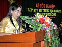 Em tên là Trương Thị Thế là học sinh k32 khóa học 2009-2011. Hôm nay, em rất vinh dự được đại diện cho tất cả các bạn học sinh toàn trường nói chung, các bạn học sinh khóa 32 nói riêng được phát biểu cảm nghĩ của mình nhân buổi “Lễ tốt nghiệp và bế giảng khóa 32 (2009-2011)”.