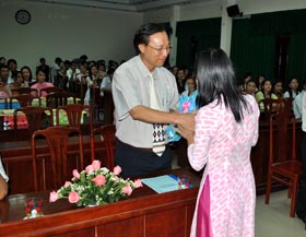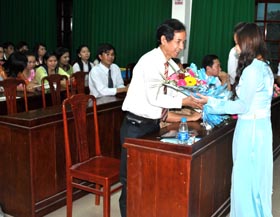 Chúng em rất tự hào, hãnh diện được là học sinh của trường Viện khi biết được rằng Viện Sốt rét-KST-CT Quy Nhơn là nơi có bề dày phát triển hết sức vẻ vang trên mọi lĩnh vực công tác được Đảng và Nhà nước giao, trong đó có công tác đào tạo đội ngũ Kỹ thuật viên xét nghiệm chuyên ngành. Chúng em cũng biết được rằng, cho đến nay, trường Viện đã và đang đào tạo 33 khóa chính quy, 03 khóa vừa làm vừa học và hiện đang tiến hành đón nhận khóa 34, với hơn một ngàn học sinh đã ra trường và công tác trên nhiều vùng miền của tổ quốc; trong đó có không ít học sinh của trường hiện đang đảm nhiệm những chức vụ quan trọng trong các cơ quan Y tế từ trung ương đến địa phương và cũng có không ít học sinh của trường đã và đang học trên đại học. | Học sinh tặng hoa cho Lãnh đạo Viện- Ban Giám hiệu. |