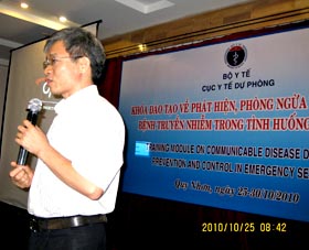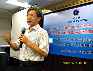 Thực hiện kế hoạch Chương trình đào tạo về dịch tễ học dài hạn năm 2010, Cục Y tế dự phòng-Bộ Y tế và Chương trình đào tạo Dịch tễ học thực địa Việt Nam thuộc Tổ chức Y tế thế giới (WHO) phối hợp tổ chức khóa đào tạo về ““Phát hiện, phòng ngừa và kiểm soát bệnh truyền nhiễm trong tình huống khẩn cấp” (Training course on Communicable disease detection, prevention and control in emergency settings) cho các học viên thuộc Chương trình đào tạo dịch tễ học thực địa dài hạn và cán bộ phụ trách công tác đáp ứng với bệnh truyền nhiễm trong tình huống khẩn cấp của các đơn vị liên quan trong phạm vi cả nước.